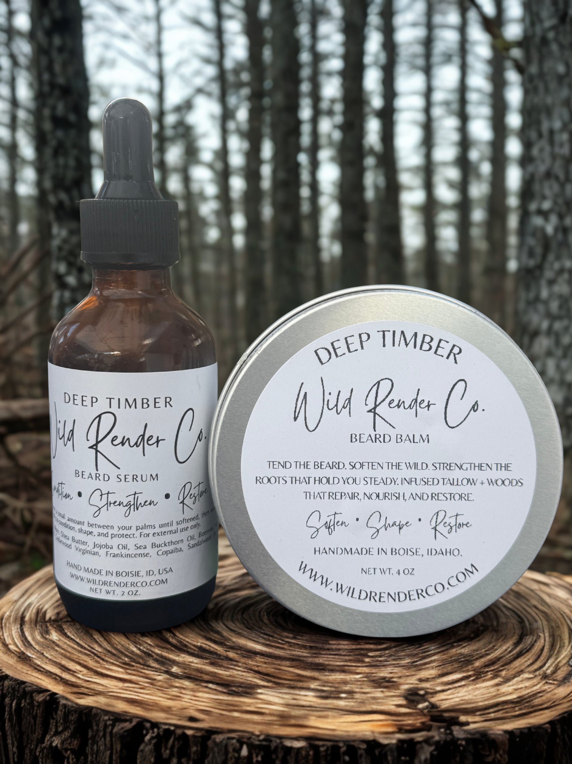 Our Deep Timber line blends grass-fed tallow and nourishing oils with warm woods like sandalwood, cedarwood, and frankincense to soften, strengthen, and restore your beard and skin from root to end.